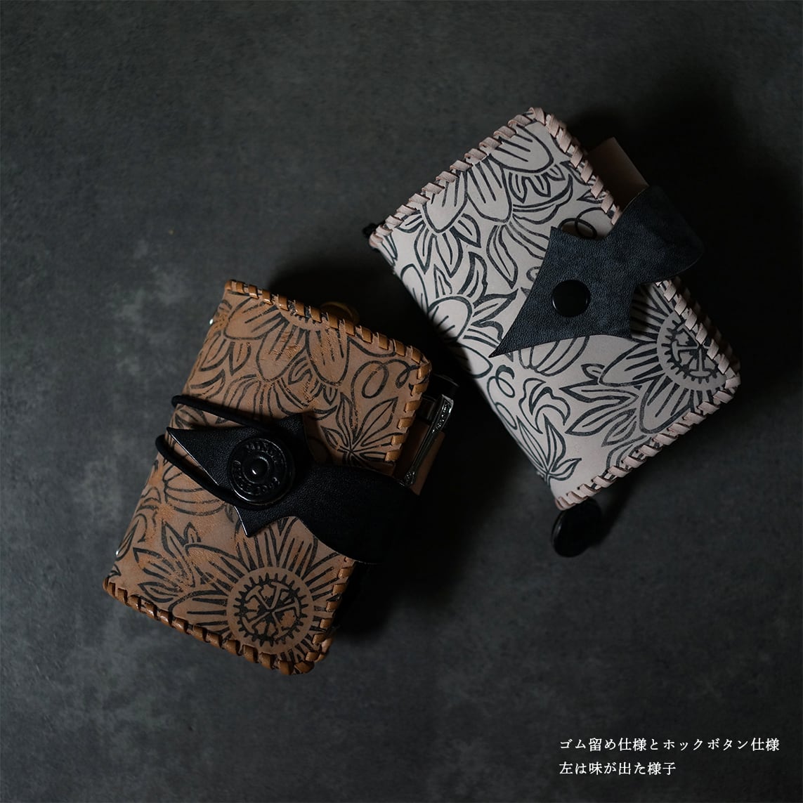 ホックボタン留めはロゴの革紐しおりをお付けしております。